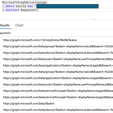let graphActivities = MicrosoftGraphActivityLog | where RequestUri contains "Roles" and UserId == "user_id" | project SignInActivityId, RequestUri; SigninLogs | where uniqueTokenIdentifier in (graphActivities | project SignInActivityId) | join kind=inner ( graphActivities ) on $left.uniqueTokenIdentifier == $right.SignInActivityId | project RequestUri, Application